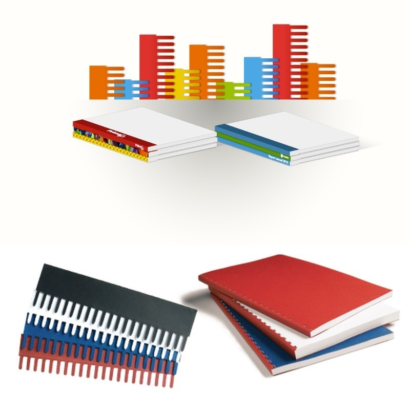 Nowy sposób bindowania dokumentów za pomocą pasków personalizacyjnych. Idealnie płaskie można zbindować do 100 kartek. Mozliwość personalizacji grzbietu..