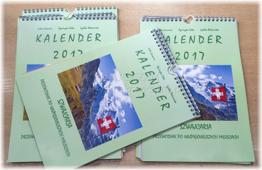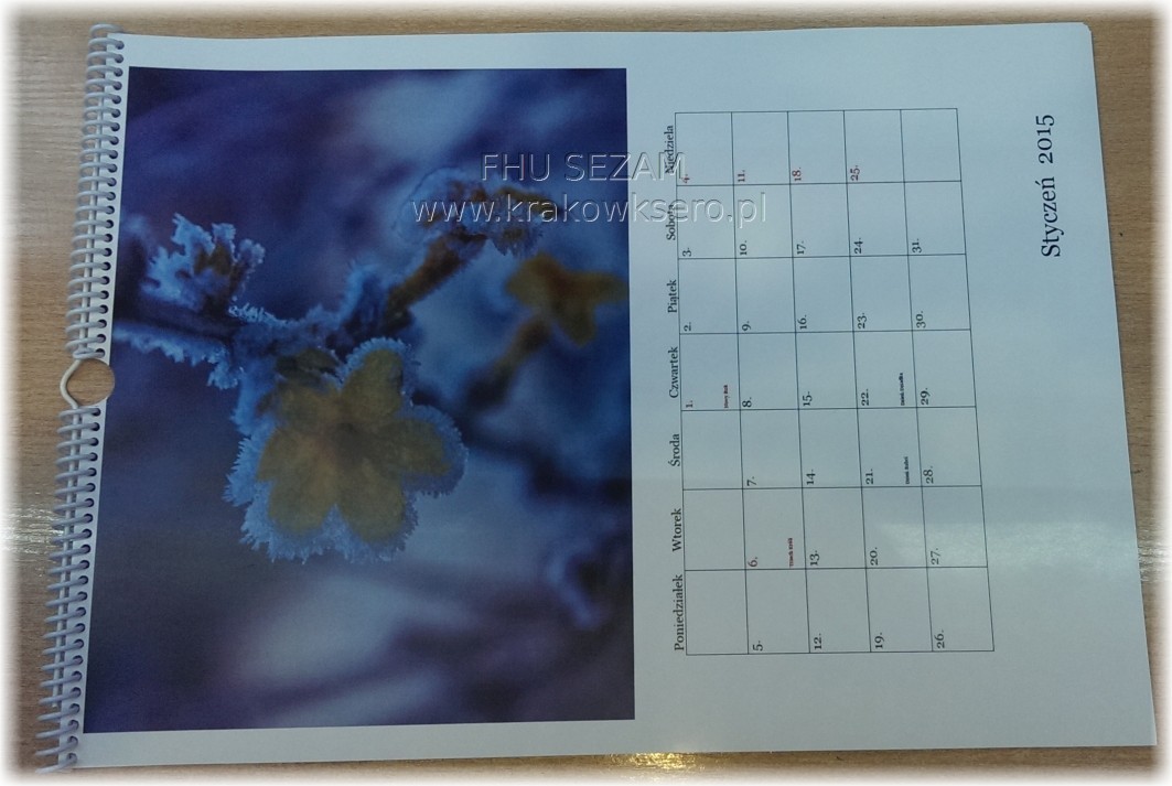 Kalendarz A4 z zawieszką. Druk na papierze kredowym lub kartonie, dodatkowo wycięta łezka umożliwiająca obracanie kartek. Zamiast zawieszki możemy dorabić podstawkę.